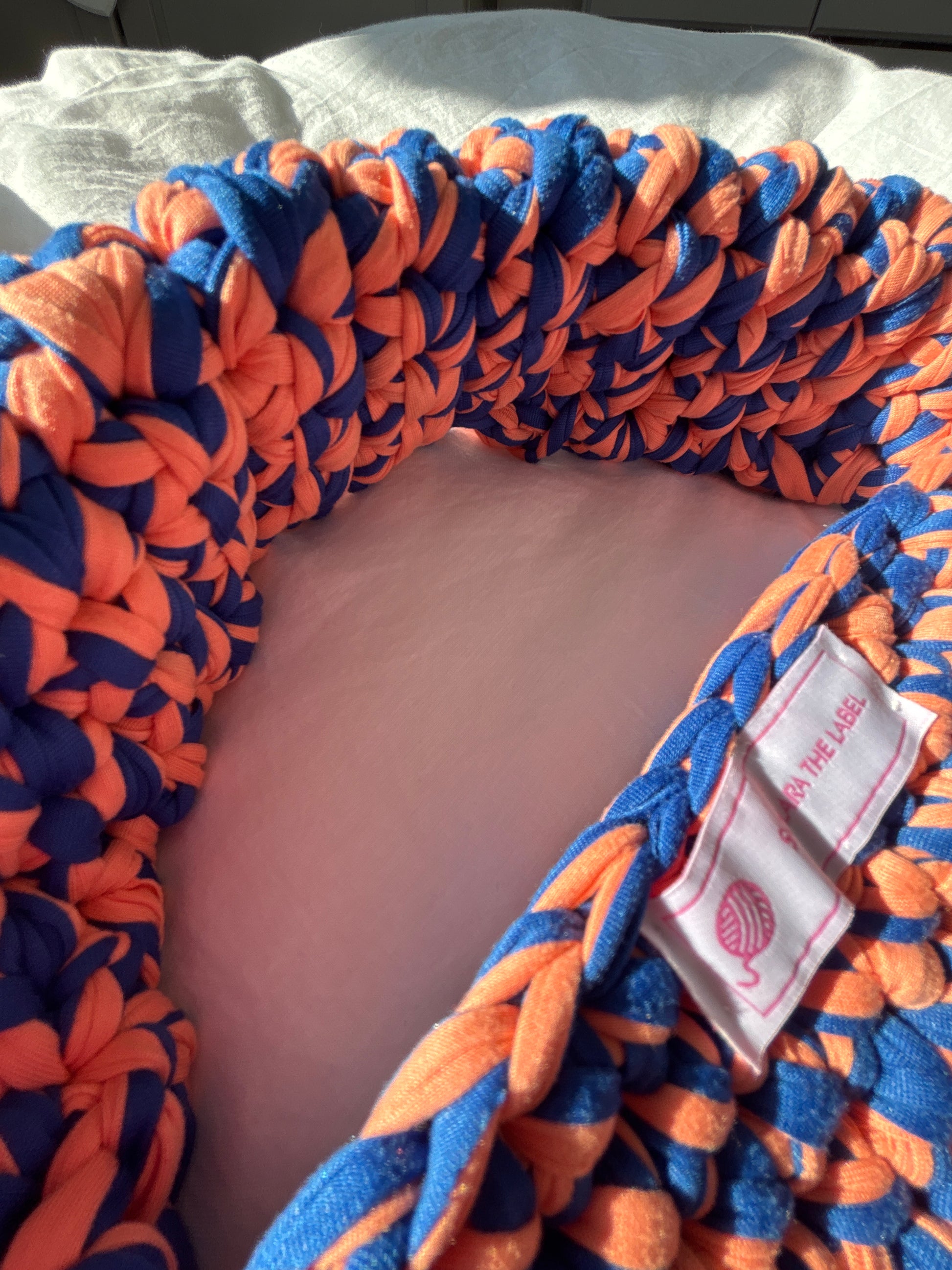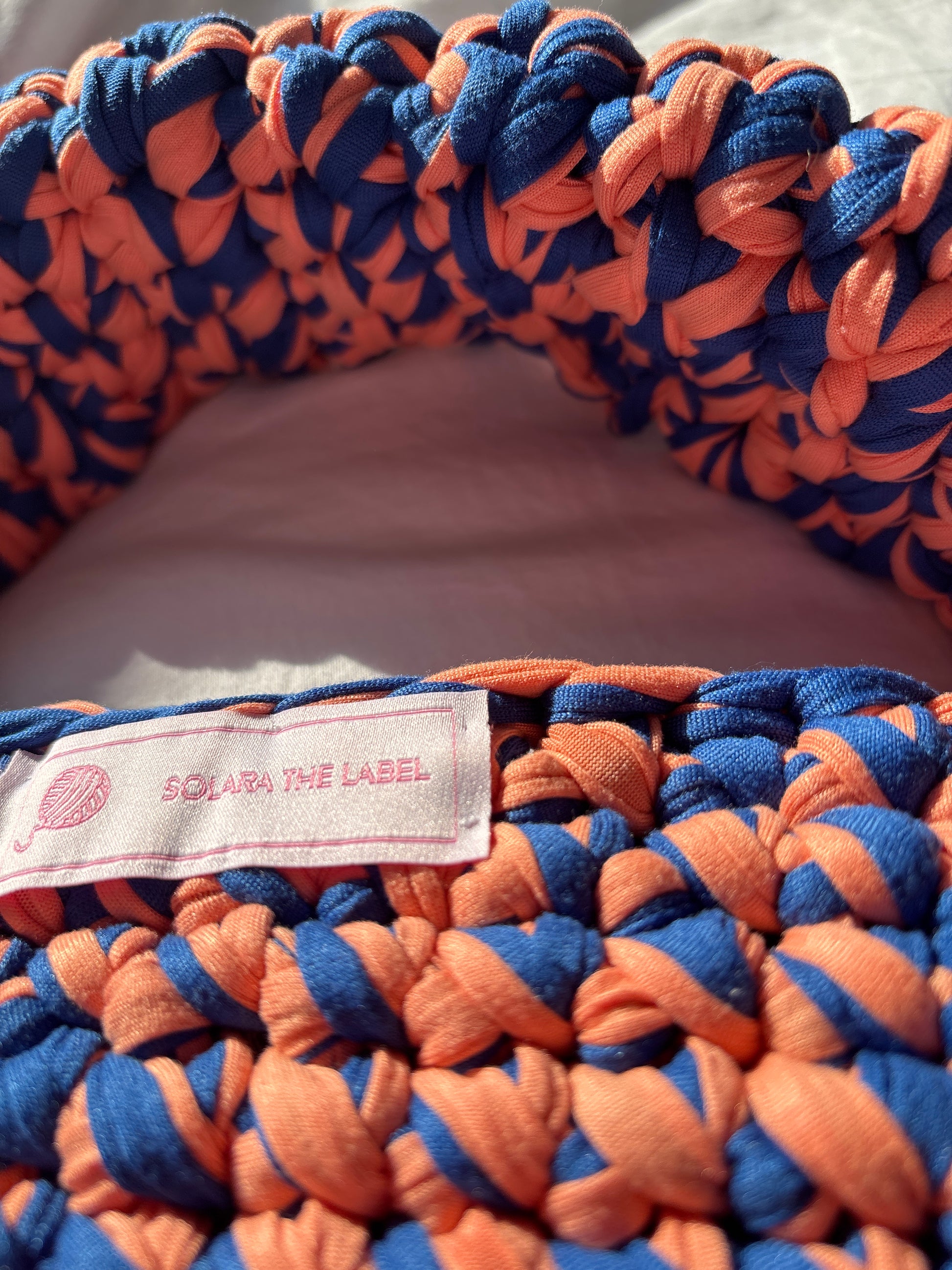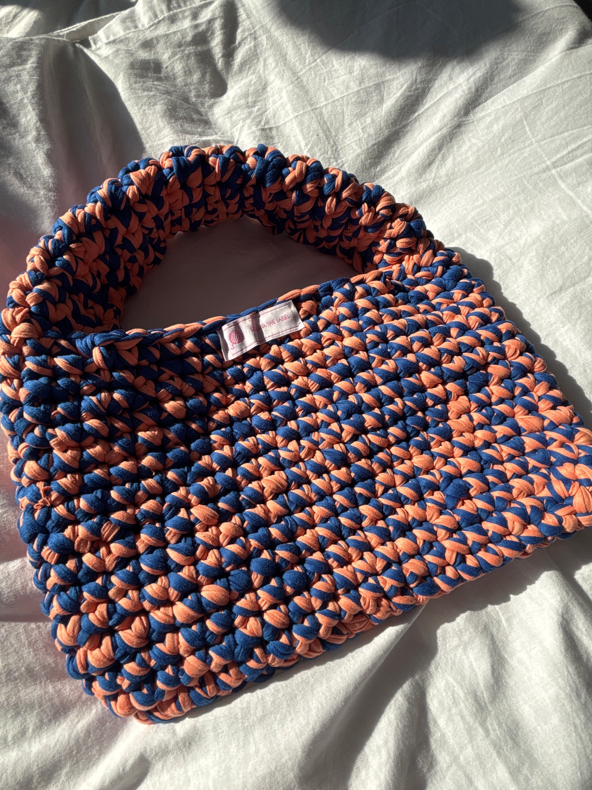 Bold, bright, and born for the beach – meet Clementine Coast. This one-of-a-kind bag features a rich twist of deep navy and zesty orange T-shirt yarn, hand-crocheted into a textured body with a signature chunky handle for ultimate comfort and style.
