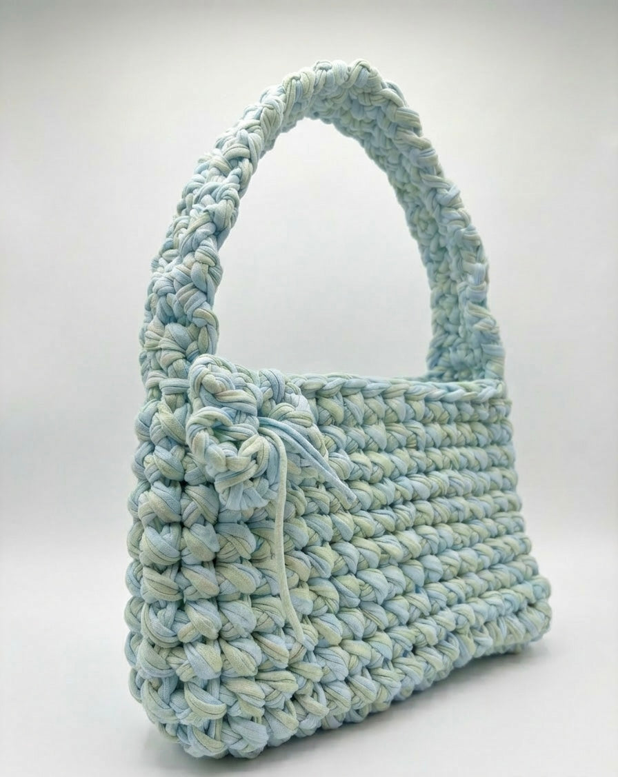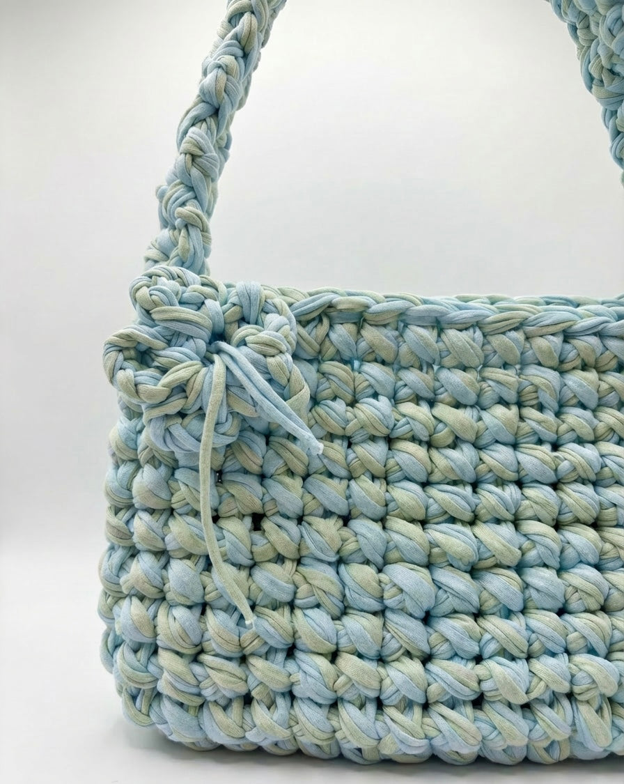 Lovingly handmade using sustainable T-shirt yarn, Mint Meadow is for the daydreamers, the nature lovers, and the souls who find magic in the little things. Inspired by breezy mornings, wildflower fields, and soft pastel palettes, this one-of-a-kind piece brings a gentle pop of colour to your wardrobe. 🌼🩵🌿