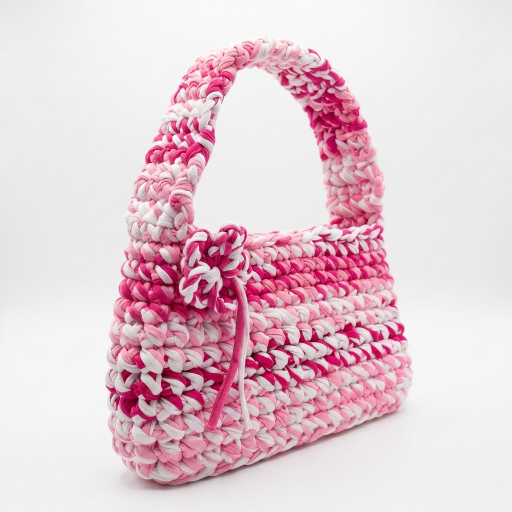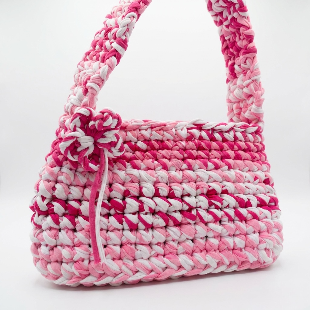 A true labour of love, Blush Bloom is made from sustainable T-shirt yarn and stitched with care for those who adore feminine flair with a side of fun. Whether you’re heading to brunch, browsing vintage markets, or soaking up the sun at a picnic, this bag brings romance and sweetness to every outfit. ☁️🍓🧺