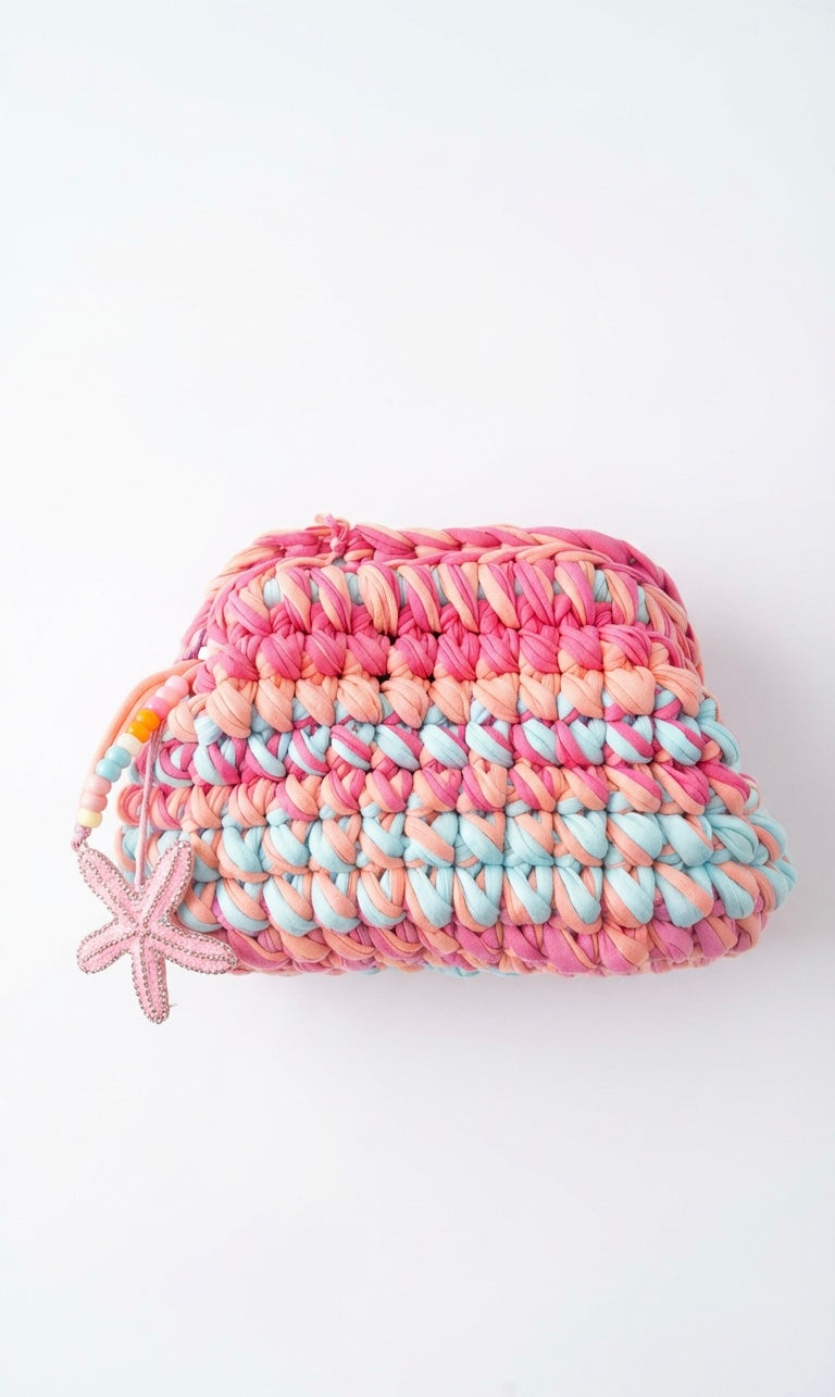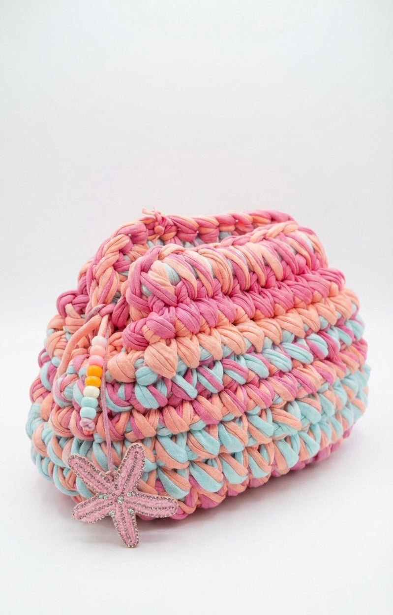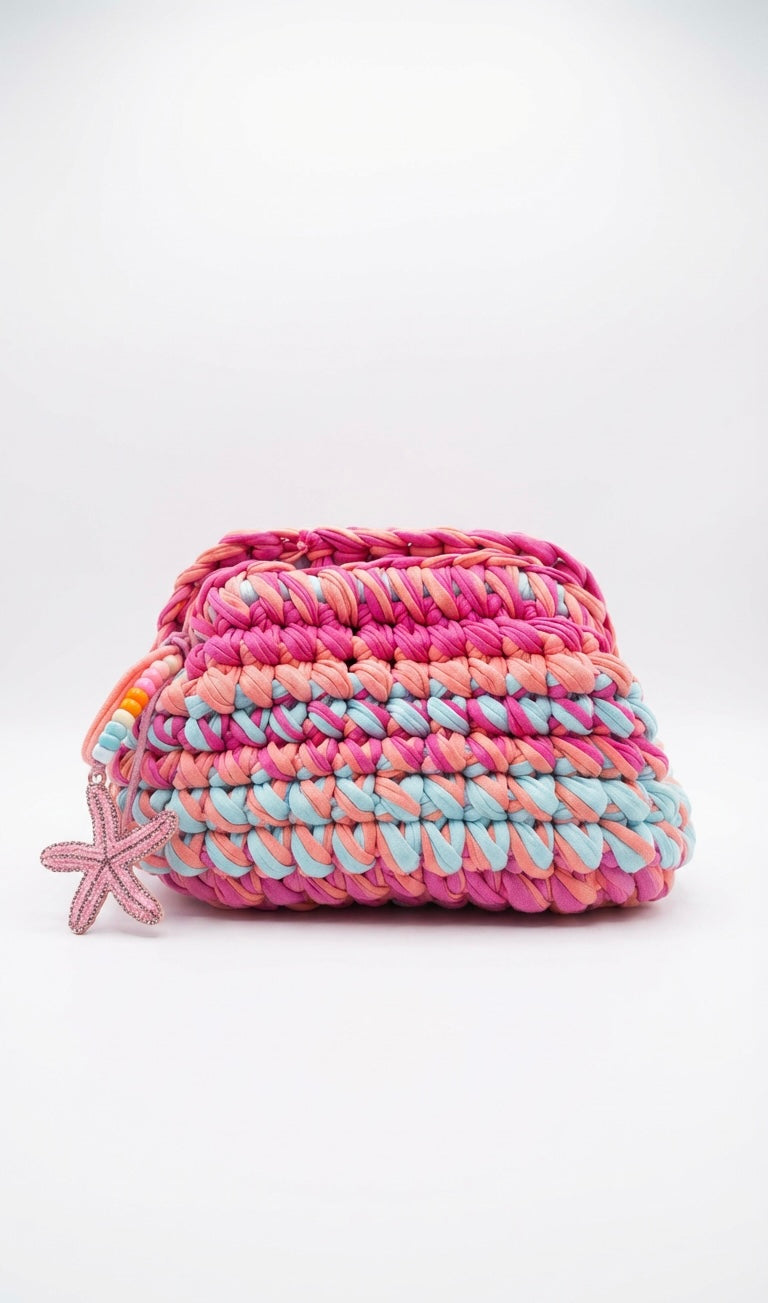 Meet your new favorite summer essential: The Starfish Clutch. This vibrant, handcrafted statement piece captures the essence of a sun-drenched day by the shore. Woven with thick, premium T-shirt yarn, it features a stunning blend of sunset pinks, coral oranges, and breezy seafoam blues.